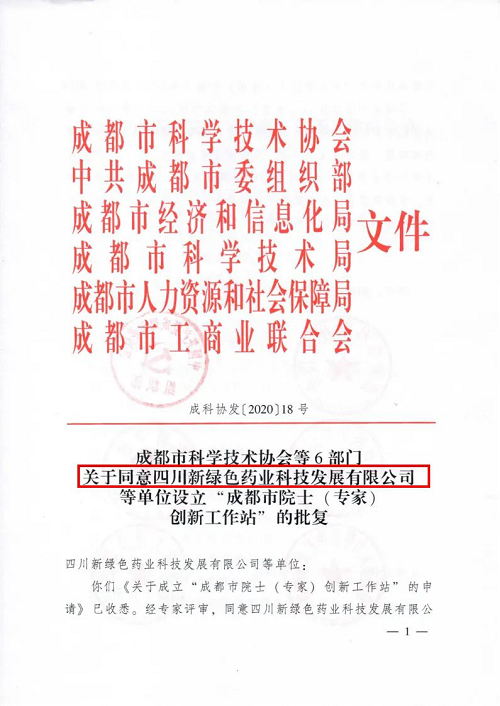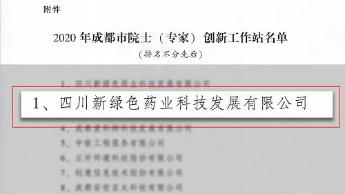 2020年12月3日,成都市科學技術協會、中共成都市委組織部、成都市經濟和信息化局、成都市科學技術局、成都市人力資源和社會保障局、成都市工商業聯合會6部門發布關于同意四川新綠色藥業科技發展有限公司等單位設立“成都市院士(專家)創新工作站”的批複,四川新綠色藥業科技發展有限公司(簡稱新綠色藥業)位列名單之首。