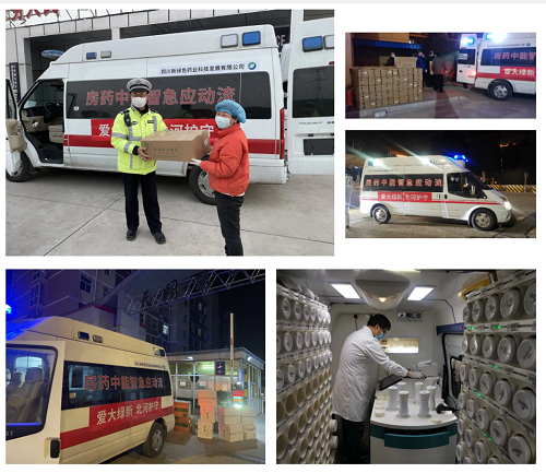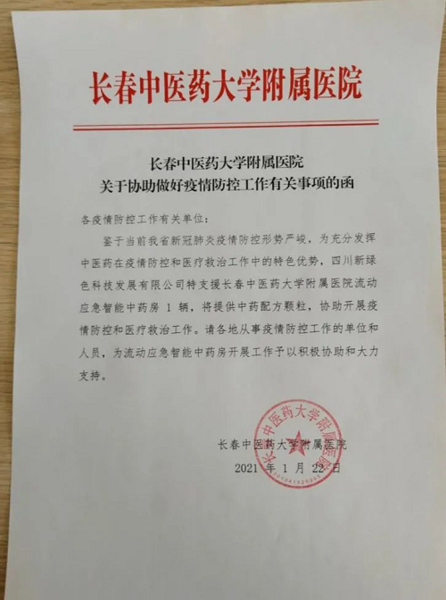 1月22日,鑒于當前吉林省新冠肺炎疫情防控形勢嚴峻,應長春中醫藥大學附屬醫院邀請,新綠色藥業迅速從長春市、彭州市兩地,各調派一輛在戰勝疫情中發揮科學技術的關鍵利器作用的“流動應急智能中藥房”星夜馳援通化市抗疫一線,協助當地開展疫情防控和醫療救治工作。