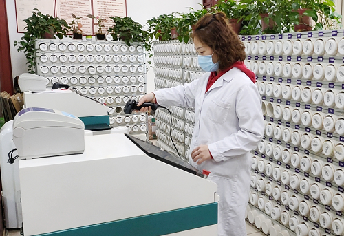 我們來到某市一家中醫院的中藥配方顆粒智能藥房,可以看到,一排排標准的白色藥瓶整齊的插入了一旁的智能藥櫃中,每一個藥瓶底部都貼有二維碼以及相對應的藥品名稱。