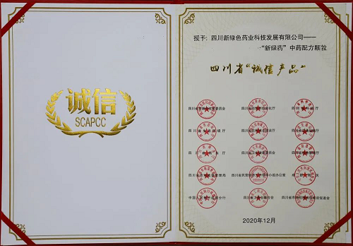 “新綠藥”中藥配方顆粒榮獲四川省“誠信産品”稱號
