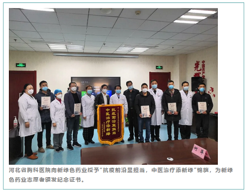 會上,河北醫療救治中醫專家組領隊、河北省中醫藥發展中心主任孫慶臣對新綠色藥業的抗疫馳援工作給予了高度評價。並代表醫院向新綠色藥業贈送了“抗疫前沿顯擔當,中醫治療添新綠”錦旗及感謝信,爲新綠色藥業的志願者們頒發了紀念證書。