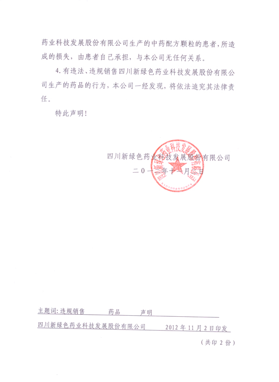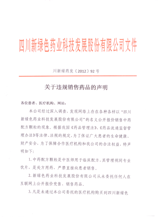 本公司經過深入調查,發現網絡上存在各種各樣以“四川新綠色藥業科技發展股份有限公司”的名義公開報價銷售中藥配方顆粒的現象。根據我國《藥品管理法》、 《藥品流通監督管理辦法》等法律、法規的規定,爲了保證廣大患者的生命健康、財産安全,爲了保障合作醫療機構和我公司的合法權益,特聲明如下: