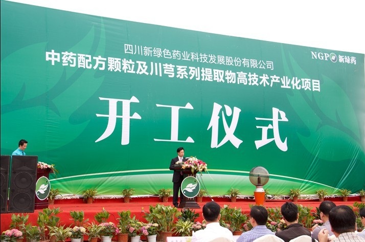 2012年5月12日,四川新綠色藥業科技發展股份有限公司在彭州工業開發區,隆重舉行“中藥配方顆粒及川芎系列提取物高技術産業化項目”開工儀式。 四川省省政府副秘書長蔡競及有關省廳局領導,成都市、彭州市領導和特邀嘉賓及媒體代表出席了開工儀式。 四川新綠色藥業科技發展股份有限公司董事長周厚成先生介紹:新綠色藥業是國家食品藥品監督管理局批准的全國六……