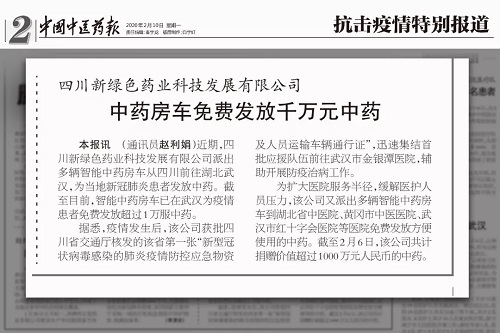 2月10日,《中國中醫藥報》抗擊疫情特別報道第二版:四川新綠色藥業科技發展有限公司派出多輛“流動應急中藥房”前往武漢等重點疫區支援,向武漢市金銀潭醫院、湖北省中醫院、武漢市紅十字會醫院、黃岡市中醫醫院等醫院捐贈中藥配方顆粒。
