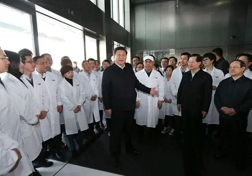 ↑2016年2月3日,習近平在江西江中集團江中藥谷制造基地考察時同企業科技人員在一起。