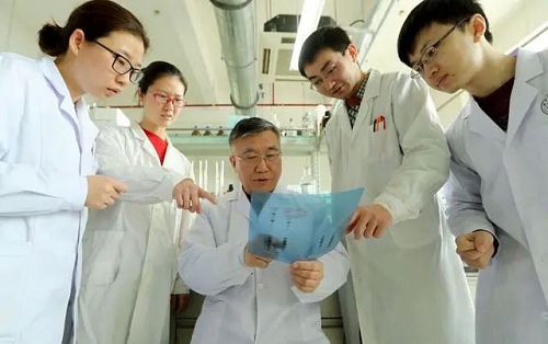 ↑2017年2月23日,河南中醫藥大學教授司富春(中)在河南中醫藥大學實驗室內和學生們一起分析實驗結果。
