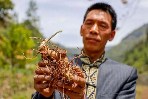 ↑2019年4月16日,重慶石柱土家族自治縣中益鄉農民汪從興展示種植的中藥材黃精。