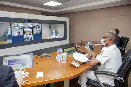 ↑2020年4月10日,四川省衛生健康委員會、四川省外事辦公室與中國駐科特迪瓦、乍得、剛果(金)和剛果(布)四國大使館共同舉辦中非新冠疫情衛生專家視頻會議。四川省醫療專家就新冠肺炎診斷和臨床治療、中醫參與抗疫經驗等問題同非洲四國衛生專家展開交流。這是在科特迪瓦阿比讓拍攝的視頻會議現場。